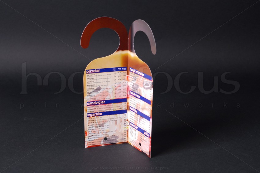 Akademi Pizza için özel tasarladığımız ve çok fonksiyonel olan bu çalışma özellikle paket servis yapan ve evlere hizmet veren firmalar için çok ideal. Çalışmada da göreceğiniz gibi ev kapılarının kapı kollarına asılabilmesi için özel olarak tasarlanan bıçak yapısı vardır. Bu tarz bir kesim, kapılara direkt olarak asılacak olan tanıtımlarınızın yere düşüp kaybolma olasılığını neredeyse tamamen ortadan kaldırıyor.