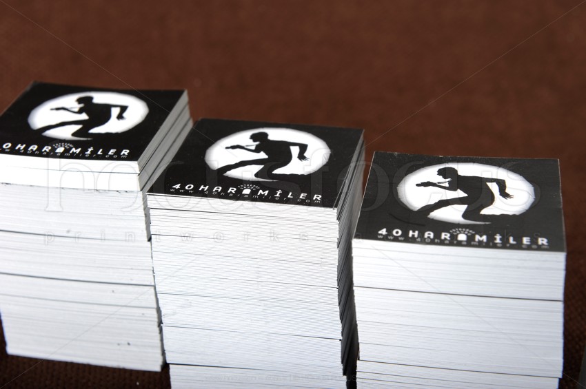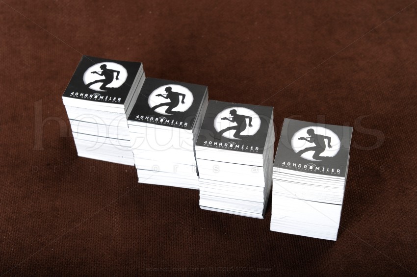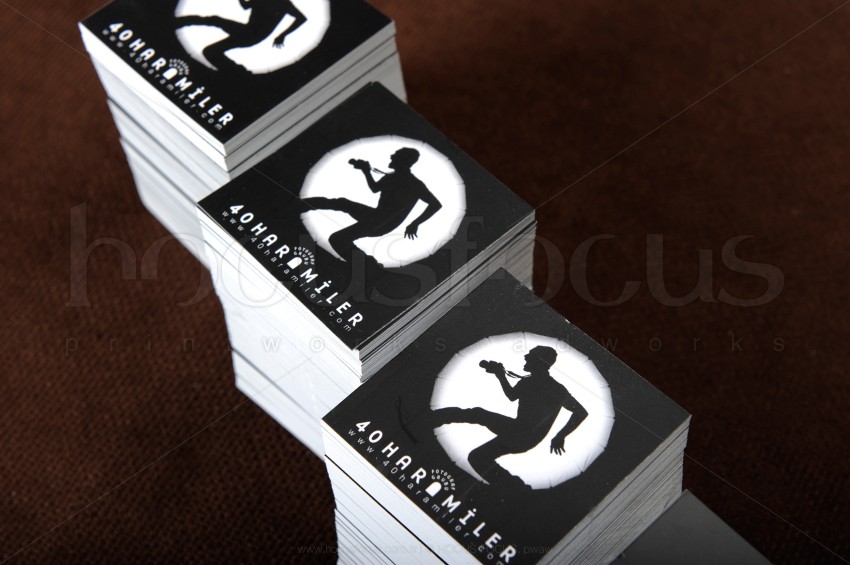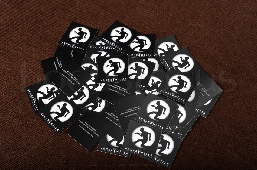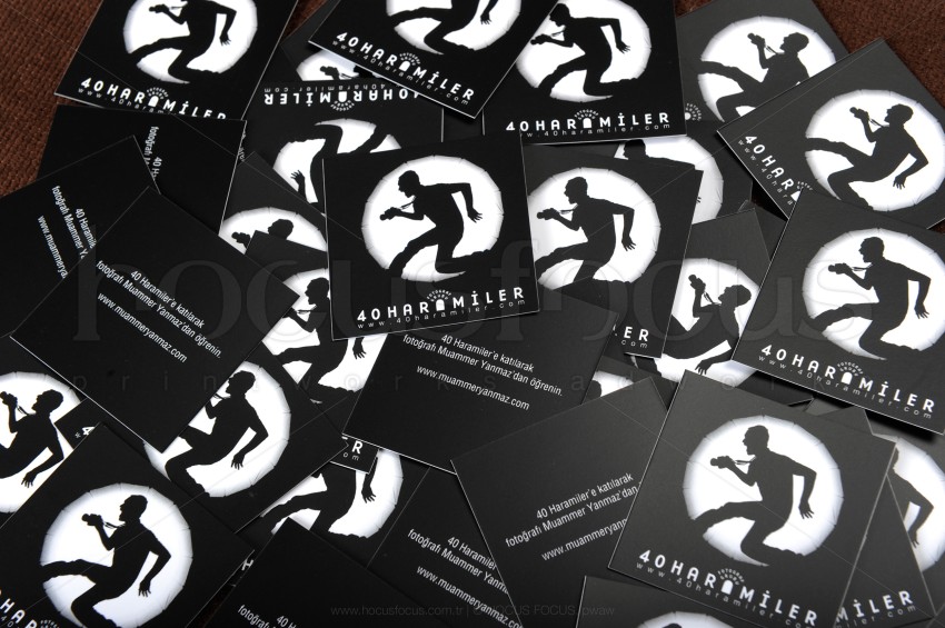 40 Haramiler fotoğraf grubunun dağıttıkları hediyelerler birlikte paketlerin içerisine konan mini kartvizitlerden ürettik. 5 cm x 5 cm ölçülerinde olan bu mini kartvizitin üretiminde kalın kuşe kağıt (350 gr/m²) kullanılmıştır. Hem kuşe kağıdın daha tok durması hem de boyanın korunabilmesi için mini kartvizitlerin her iki yüzüne de mat selefon kaplanmıştır.