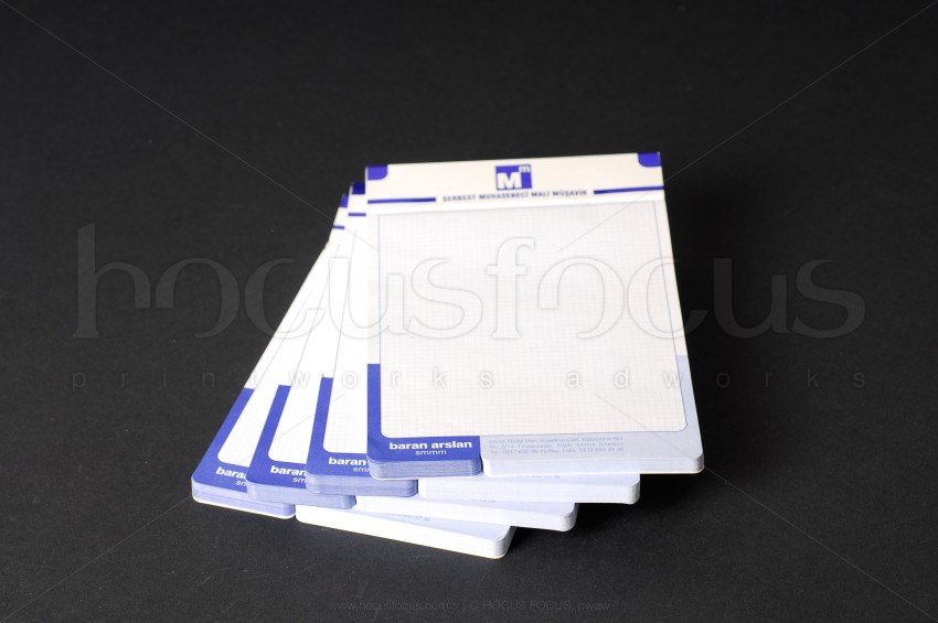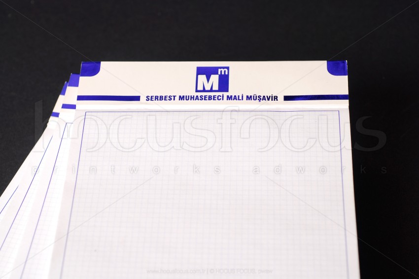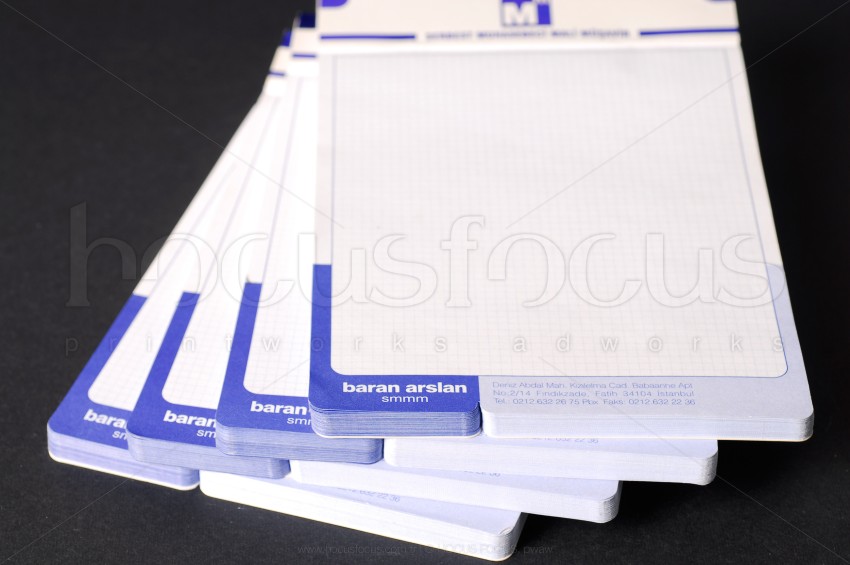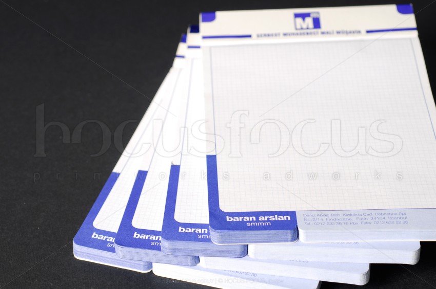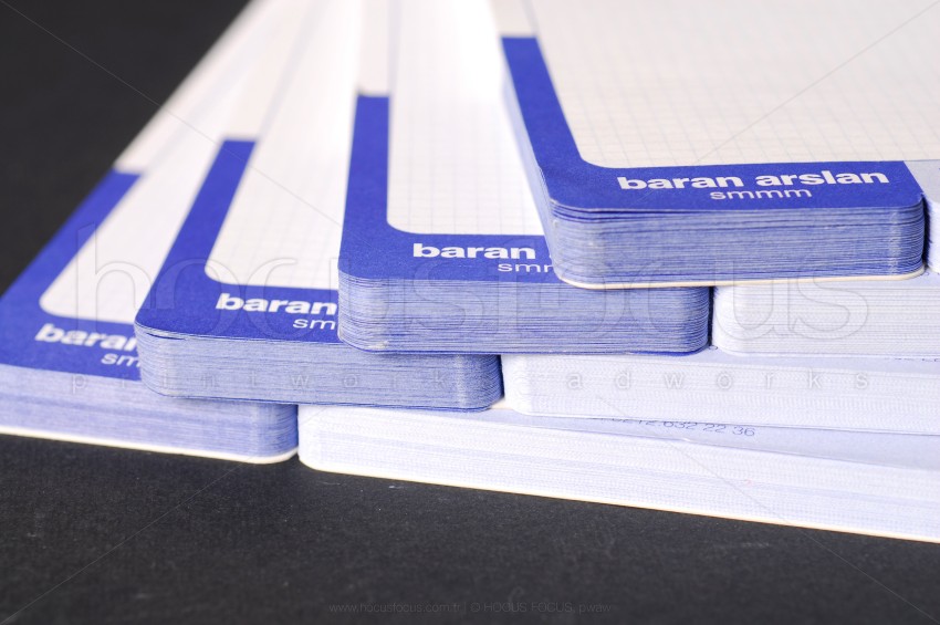 Serbest muhasebeci mali müşavir Baran Arslan için özel tasarlanmış bu bloknot modelinin takibi olan antetli kağıt tasarımını da yaptık. Bu modelin üst kısmında hem gofre (kabartma) hem de mavi varak baskı uygulaması kullanılmıştır. Yaprakların hepsinde özel kesim uygulaması vardır. Hem ofis içi kullanım için hem de müşterilere dağıtılmak için düşünülmüştür. Kağıt için standart kağıdın dışında orta incelikte (100 gr/m²) 1. hamur kağıt kullandık. Tüm yaprakların kolay koparılabilmesi için çok ince perforaj uygulaması yaptık.